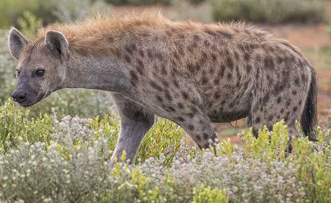 W południowej i wschodniej Afryce, na południe od Sahary, występuje hiena cętkowana zwana też plamistą (Crocuta crocuta). Żyje ona pojedynczo na stepach, w lasostepach, a niekiedy także na pustyniach. Długość jej ciała wynosi około 1,3 m (zdarzają się i większe okazy), a wysokość w kłębie około 80 cm. Sierść jest rdzawobrązowa lub szara w ciemnobrązowe cętki nierównomiernie rozrzucone.